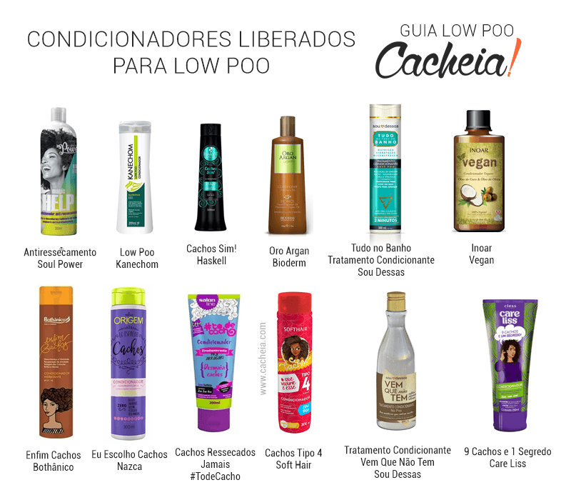 Depois de começar a técnica você poderá usar shampoos sem sulfato para higienizar os fios. No final dessa postagem você encontrará alguns exemplos de shampoos “liberados para low poo”. Quem segue o low poo não precisa obrigatoriamente fazer co-wash. O co-wash é a estrela do no poo. Mas se você quiser, pode fazer co-wash às vezes. Mas óh: use o shampoo sem sulfato pelo menos uma vez por semana, não vai esquecer heim! Se você está seguindo o low poo, você não deve substituir o shampoo low poo só por lavagem com condicionador. O condicionador comum não é capaz de fazer uma limpeza eficiente nesse caso. Aliás, uma boa dica é usar um condicionador específico para co-wash. Olha aí os exemplos: