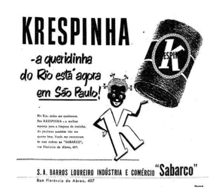 Propaganda de 1952 da Esponja de aço “Krespinha”. “No Rio, todos me conhecem. Sou Krespinha – a melhor esponja para a limpeza da cozinha. As paulistas também vão me querer bem”. Fonte: Propagandas Históricas