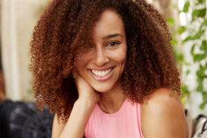 • Close up shot of positive dark skinned teenage girl has Afro hairstyle, dressed casually, has shining smile, rests indoor with close friend or boyfriend, being in good mood. People, beauty, ethinicity
