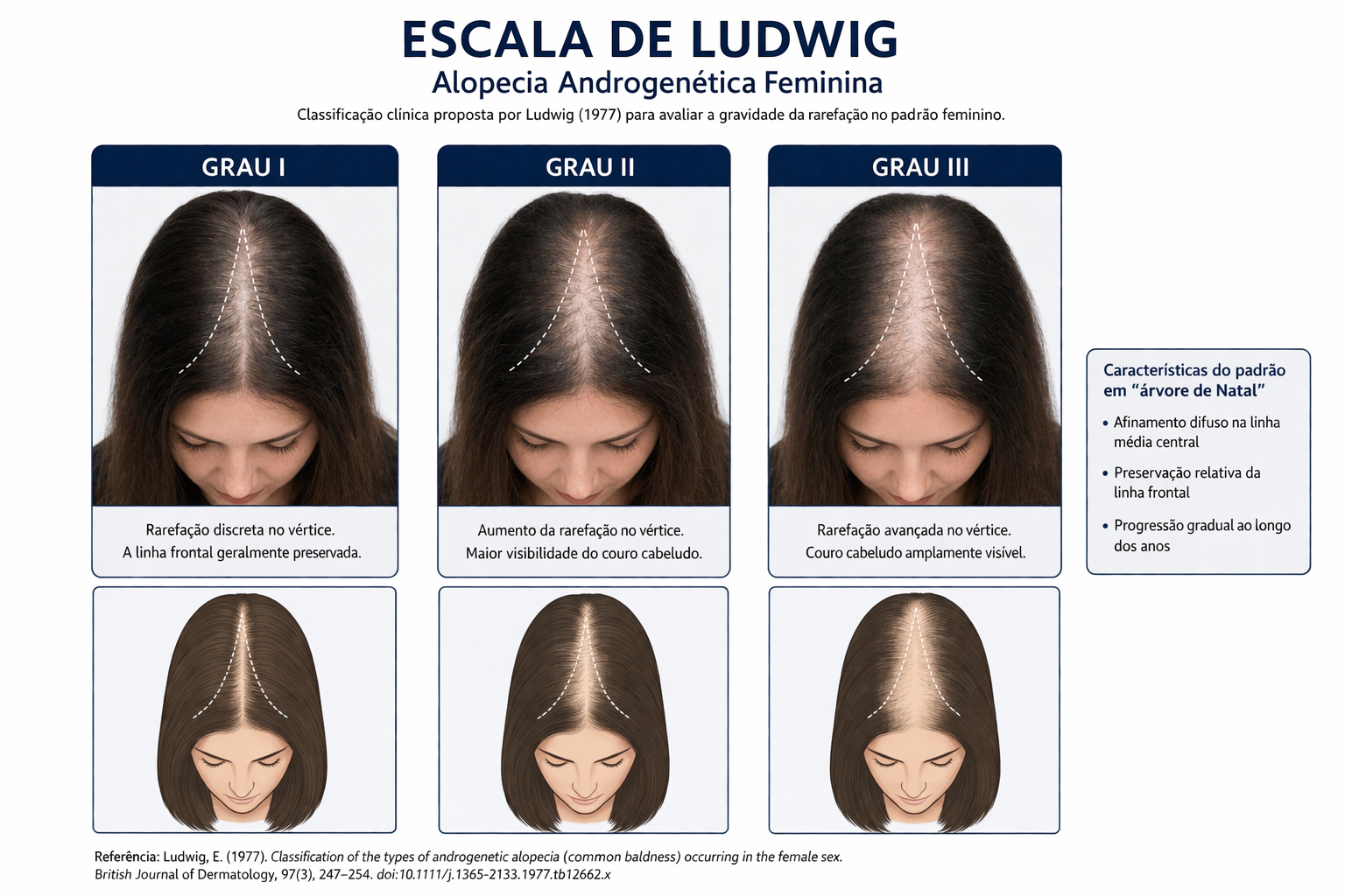 Diferente do padrão masculino, a alopecia androgenética feminina geralmente se manifesta como afinamento difuso na região central do couro cabeludo, com preservação relativa da linha frontal. Ou seja : dificilmente ficamos totalmente calvas. Além disso, nossas “entradas” não costumam ser tão grandes.